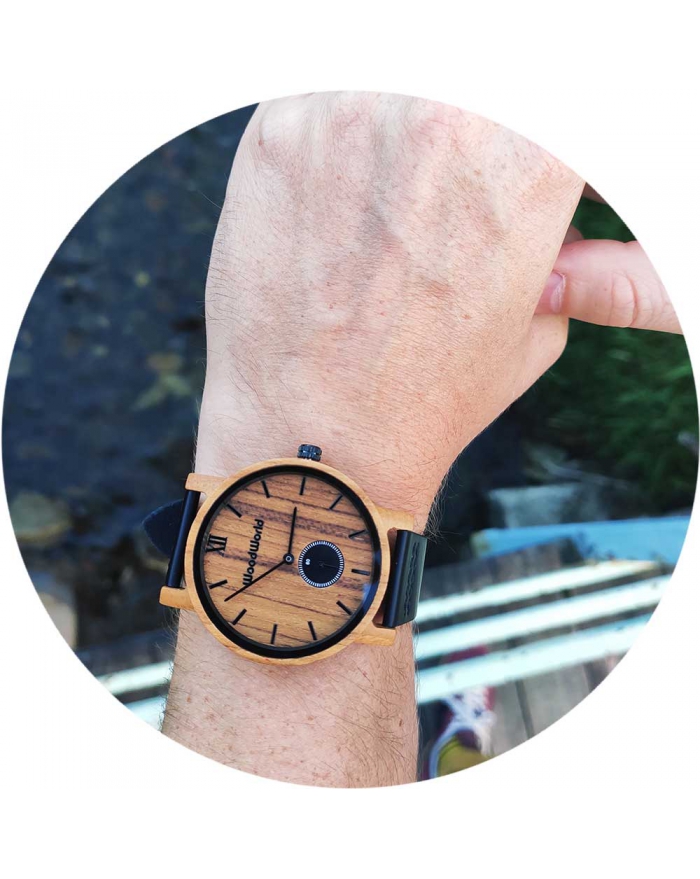 Drewniany zegarek ze skórzanym paskiem - Olaf Black to sportowa elegancja w najlepszym wydaniu. Został zaprojektowany z myślą o tych, którzy lubią łączyć naturalne materiały z pięknem codziennego życia. Czarny skórzany pasek regulowany do dowolnego rozmiaru nadaje mu sportowego charakteru. Ten model dodatkowo wyróżnia dodatkowa mała czarna tarcza z sekundnikiem nadającą wyjątkowego wyglądu!